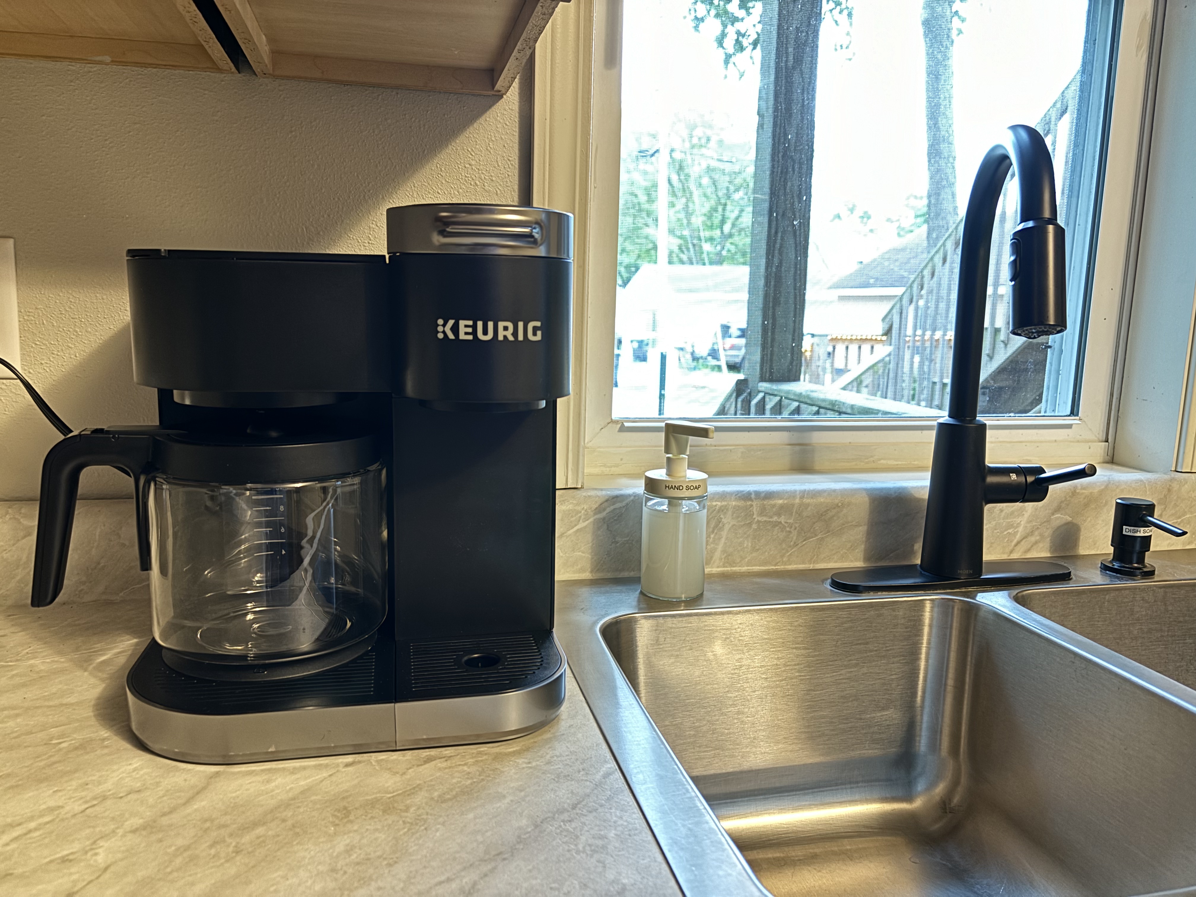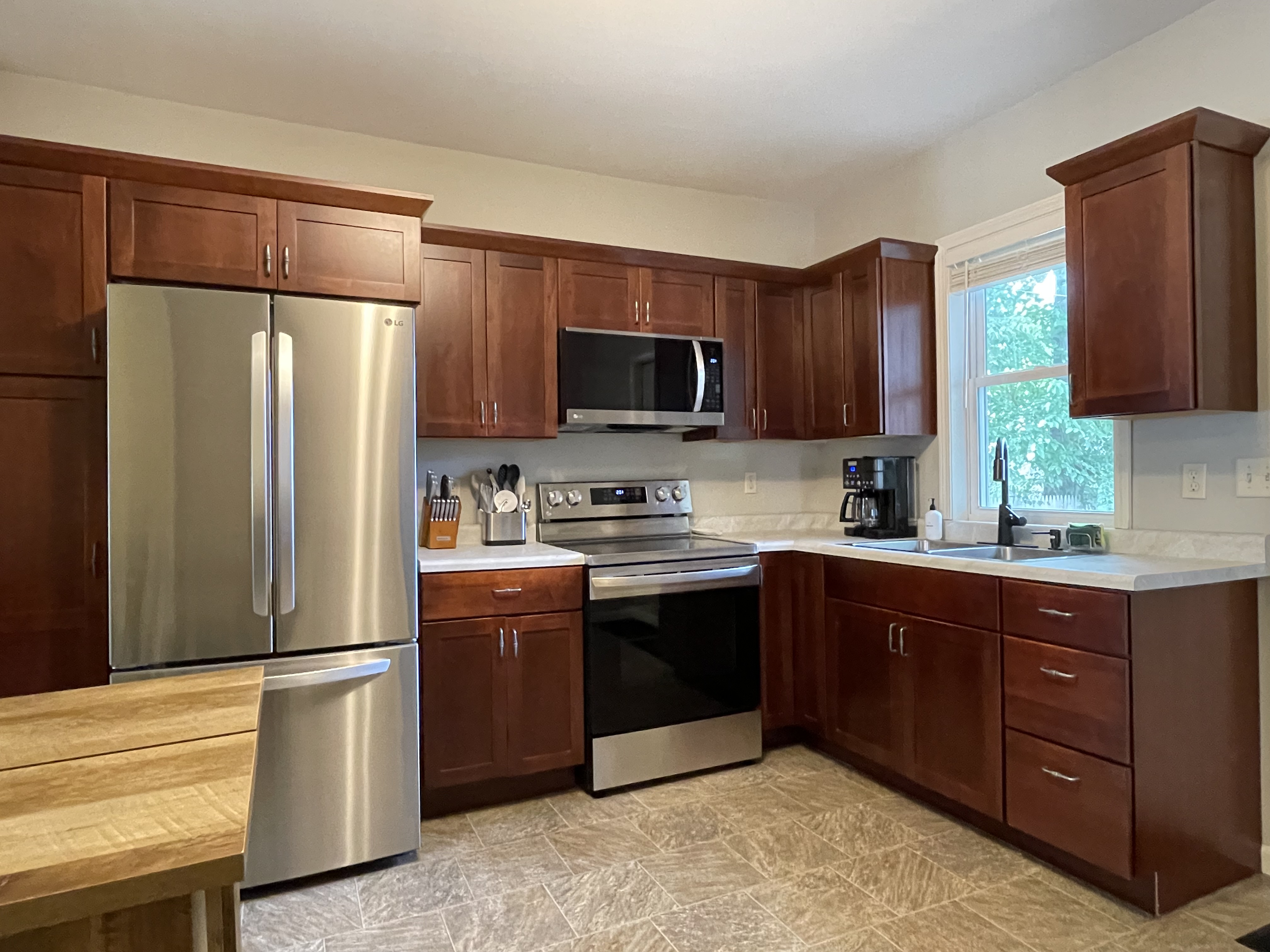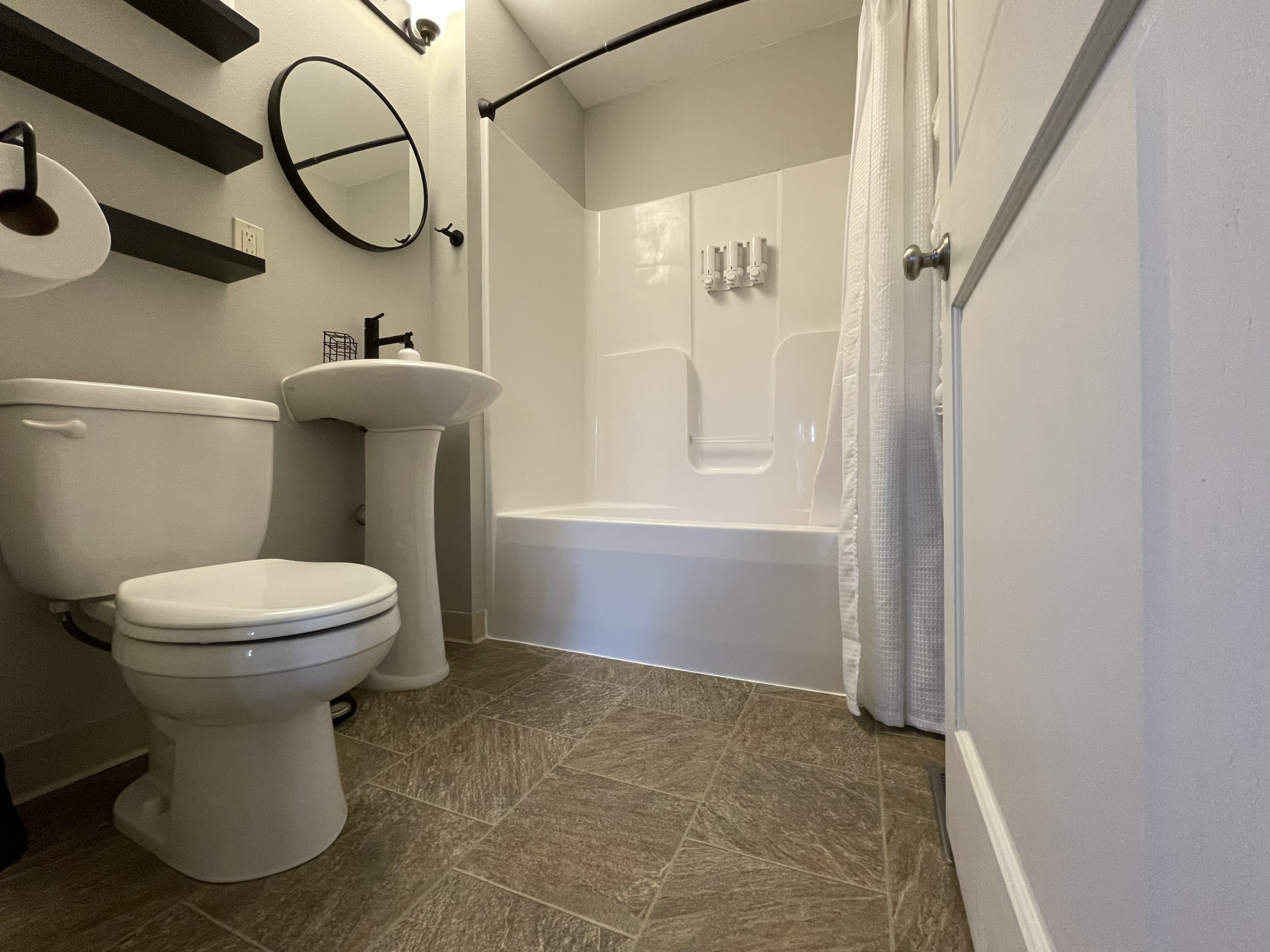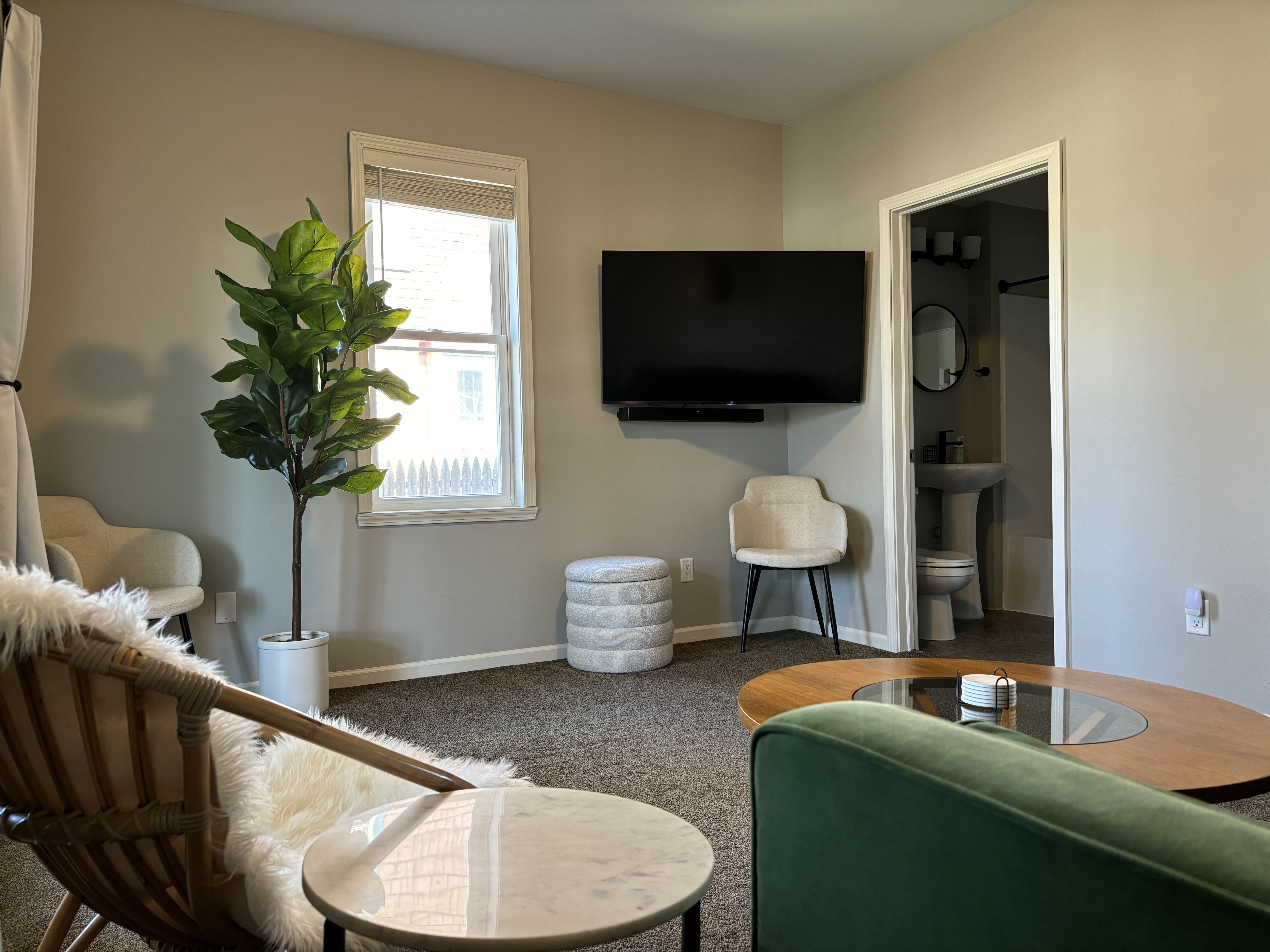BEDROOMS: Rest peacefully in three private bedrooms, each with a medium feel Helix memory foam mattress and four pillows. Every room includes a closet with hangers, charging hubs for your devices, a wireless charging alarm clock, a sound machine, a full-length mirror, two luggage racks, and a reading light. LIVING ROOM: Relax on the plush velvet couch or curved rattan chairs while you watch your favorite shows on the 55" Roku TV in guest mode. Sign into your own streaming apps over our 300 Mbps Wi-Fi or watch Roku channels and local antenna TV when reception allows. Enjoy game night with Cards Against Humanity, Exploding Kittens, Coup, and a classic deck of cards. Please note that some noise may be heard from the upstairs Airbnb unit. KITCHEN: Prepare homemade meals in the fully stocked kitchen with a refrigerator, stove, microwave, toaster, blender, coffee grinder, hot water kettle, and a dual 12 cup/K-Cup coffee maker. Cabinets are stocked with mixing bowls, baking sheets, measuring cups, cutting boards, food storage containers, and more. We provide K-Cups, green tea, sugar, and non refrigerated coffee creamer, plus olive oil, cooking spray, salt, and pepper. Bring your own coffee beans if you prefer drip coffee. Enjoy your meal at the 4 seat high top table. BATHROOM: Enjoy the compact, well-appointed shower/tub combo with a movable magnetic shower head. You will find bath towels, hand towels, washcloths, and dedicated makeup towels, along with Public Goods hand soap, shampoo, conditioner, and body wash. A Revlon hair dryer is also available for your convenience. HEATING & AIR CONDITIONING: Stay comfortable year-round with central heating and air conditioning for consistent, efficient climate control. 3 SEASON PORCH: Unwind on the vintage bamboo furniture, perfect for reading, coffee, or chatting. Keep in mind it is not temperature controlled and you will hear traffic noise from the street out front, but there is a ceiling fan for warmer days. PARKING: Park stress free in your reserved half of the 50 foot off street lot. It can fit two cars side by side, with room to park additional cars in a line behind them if your group coordinates departures.
